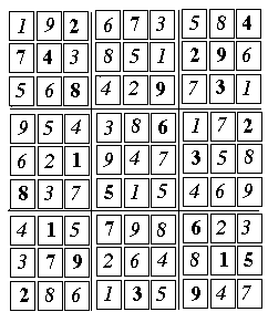 A Sudoku puzzle contains 9 rows of 9 numbers, each containing (1, 2, 3 ... 9) in a different order, and the same holds for the columns. In addition, however, each Sudoku array can be divided into 9 smaller 3-by-3 squares, each of which which also must contain all the numbers (1,2,3....9). In fact many such arrays exist. The challenge of the puzzle is--given just some of the numbers of a specific array, fill in the missing ones, using only logical deduction based on the above requirements. The puzzle consists of a square array of 81 cells, which can be divided into 9 columns, (counted from the left), each containing 9 cells. In each column, cells are numbered from the bottom. Or else, it can be divided into 9 rows (counted from the bottom), each containing 9 cells. In each row, cells are numbered from the left. A notation like 6 (3,2) will mean the number "6" in cell 2 of column 3 Extra division lines (or darker ones) divide the array into 9 boxes, each with 3 rows of 3 cells each. To define the positions of boxes, it is easiest to classify them by stacks and tiers: Three boxes in a vertical columns will be called a stack (distinguishing left, right or middle stacks) Three boxes in a horizontal row will be called a tier (distinguishing bottom, top or middle tiers) The requirement of the puzzle: