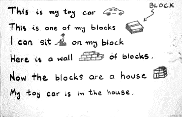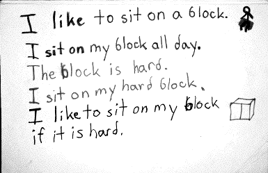 Because the initial vocabulary is so limited, very few prepared texts are satisfactory at this stage. Instead we found it best to produce the reading material by ourselves, drawing it on sheets and cards with a felt marker, in letters about 3/4" high. Some early phrases were (written here in capitals, though regular writing was used): |