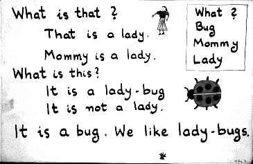 Phrases were also read in newspapers, and if they contained a hard word, we would supply it ourselves when its turn came. Most parents who teach their children to read (and many who do not) read aloud to their children from books, often before bedtime. Somehow we skipped that step: even the simplest books we found were significantly above the level reached here, and meanwhile our children enjoyed the personalized attention of the process described here. By the time they could enjoy easy books (like "Go, Dog, Go") they were also able to read them unaided, and did so. Since then (added 2014) that gap was filled, and the material (actually about 40+ years old) is freely available on the web, scanned and posted by Dr. Brian Marriott, MD., on http://marriottmd.com/sam/index.html. These are charming illustrated booklets at the level of rank beginners, and are highly recommended. From here our children advanced to large sheets, each of which carried a few sentences or a short "story." We were lucky to obtain for this a stack of posters printed on heavy white paper (originally 22" by 16", but cut in half for easier handling), one side covered with print but the other still usable. We wrote down "stories" using felt markers, illustrating them with vignettes and using several colors in the illustrations, though only black letters in the text. The texts themselves were often taken from the children's own experiences and are reproduced below (in black and white only). The sheets were quite durable and in spite of extensive handling we still have them--bent, soiled but usable. Two early examples are shown here: