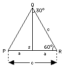 Consider the triangle PQR (drawing) with all three angles equal to 60°. By symmetry, all three sides are equal too (a more rigorous proof exists, but we skip it). Drop a line QS perpendicular to PR: it divides the big angle into two right-angled triangles with sharp angles of (30°, 60°), which is the kind we are interested in. By symmetry, the triangles are of equal size and shape ("congruent") and therefore (skipping another proof)