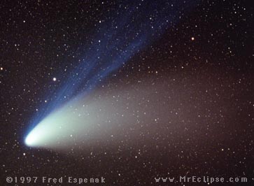 Typically 1-20 km across, a comet is a collection of frozen gases and dust (a "dirty snowball") which had accumulated in the outer reaches of the solar system and was nudged into an sunward orbit. As the comet approaches the Sun, its frozen gases evaporate in the heat and a long tail is formed, pushed away from the Sun by sunlight and by the solar wind. The tail thus points behind the comet as it approaches the Sun but ahead of it when it recedes again.