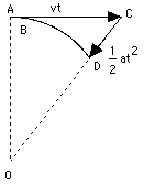 If the motion is followed just for a very brief moment, the path AB covered is so short that its curvature can be neglected, allowing one to view the motion as proceeding in a straight line, with velocity v. After a while, however, the difference between this motion and a straight-line one becomes obvious: the straight motion with velocity v would bring the particle to point C, at distance AC = vt while the actual motion brings it to some point D on the circle, whose center will be denoted by O. It is useful to regard this motion as the sum of two separate motions: a straight-line motion from A to C, and then an added motion from C to D which returns the particle to the circle. As noted earlier (section on vectors), when a motion is the combination of two simpler motions, the resulting displacement can be obtained by deriving separately the displacements produced by each motion alone, then adding them together. The added motion from C to D is the one of interest here. Its direction is always towards the center, and the distance CD covered by it--denoted here by x--can be obtained from the theorem of Pythagoras, applied to the triangle OAC (the calculation resembles the one which gave the distance to the horizon in section (8a)). In that triangle, OA = R, AC = vt, OC = R + x. Therefore R2 + v2t2 = (R + x)2 = R2+ 2Rx + x2 Subtract R2 from both sides v2t2 = 2Rx + x2 = x(2R + x) If the time interval t is very short, x is much smaller than 2R and can be neglected by comparison. Then v2t2 = 2xR or x = 1/2 (v2/R) t2 But by an earlier formula, in the section on acceleration, this is exactly the distance covered in time t by a motion with acceleration a = v2/R The above result suggests that steady motion around a circle, at least for a short time span, can be viewed as the sum of a straight-line motion with fixed velocity v, plus an accelerated motion towards the center of attraction, with the above acceleration, a. The conclusion is correct, even though the derivation is somewhat irregular. The conventional derivation (like most of the theory of motions) requires the use of differential calculus, the study of changing quantities and of the way they change, as well as familiarity with vectors. Centripetal acceleration and centripetal forceThe acceleration a = v2/R towards the center, needed to keep an object moving in a circle, is called its centripetal acceleration, from Latin petere, to move towards. By Newton's laws, any acceleration requires a force. If a stone (or any other object) of mass m rotates with velocity v around a central axis O, at distance R from it, a force F must constantly pull it towards the center, and F = ma = mv2/R This is known as the centripetal force, and by continually pulling the stone, it keeps the string stretched. If the string would break--for instance, at point A in the drawing--the stone would continue with velocity v in a straight line along AC. And no, it would not fly outwards along OA, as some believe, even though that was the direction in which the string was stretched! |