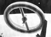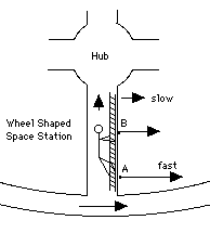 The science-fiction film "2001: A Space Odyssey" featured spinning space station, whose rotation provided the crew with "artificial gravity." It was a wheel-shaped structure, with hollow spokes connecting the wheel to a cabin in the center (drawing). The cabin in the middle was where transfers between the station and visiting spacecraft took place. Click here for more on that design. Given such a rotation, something like gravity would indeed be produced, with "down" being towards the outside (Larry Niven expanded that notion into the fanciful science-fiction novel "Ringworld" and its sequels). When calculating this effect it is simplest to use the station's frame of reference and add a centrifugal force to all other forces there. However, when one moves in this rotating environment, especially motion up and down the spokes, an additional force is encountered, named for the Frenchman Gaspard Gustave de Coriolis (1792-1843).