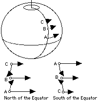 Imagine next that the points are moved to the southern hemisphere, reversing their order, so that A remains closest to the equator and is still the fastest-moving point of the three. The flow from A is still deflected to the right and the one from B to the left, but because the north-south order of the points is now reversed, the resulting swirling is clockwise.