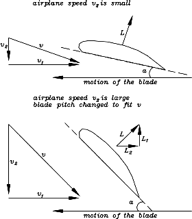 Landing safelyA speed of 600 mph at an altitude of 10 km seems to imply a sea-level landing speed of 300 mph (D is 4 times larger, so v can drop to 1/2). That is still too fast--even the space shuttle is said to land at 270 mph. One could fly at 70,000 feet (about 20 km) the way the U-2 reconnaissance plane does, and land (even without changing the angle of attack) at 150 mph. However, to create the necessary lift in the thin air at that height, A must be much bigger--that is, the wing must be much larger--or else the weight W must be reduced (or both). That was done for the U-2, a light-weight airplane with a very long and efficient wing, but such a design would not work on the scale of an airliner.The practical solution is to increase the angle of attack during landings, and to temporarily increase the size of the wing. If you ever sat near the window of a landing airliner, you may have noted extra wing surfaces sliding out on the final approach, to provide more lift--and if you watched such an airliner from the ground, you would see that these surfaces extend downwards from the wing, at a steeper angle. All that of course makes drag much larger, but a landing airplane must anyway get rid of its extra speed. All these allow the airliner to land at about 150 mph. Landing is actually a precision maneuver, in which the airliner (ideally) runs out of airspeed just before its wheels touch the ground. Glide slope radars and other navigation aids make it possible, thousands of times each day. Non-stop around the world--How high? How fast?One of the more memorable feats in aviation was the non-stop non-refuel flight of the Voyager airplane around the world, in December 1986. Designed by Burt Rutan and piloted by his brother Dick and by Jeana Yaeger, the plane now hangs above the lobby of the National Air and Space Museum in Washington.Initially the hope was to have a pressurized cabin and to fly at 25,000 ft., but weight limitations precluded that, so that a slower, lower flight was undertaken, lasting 9 days. The take-off weight of "Voyager" was 9700 pounds, and to lift such a heavy airplane, it used two engines--one pushing and one pulling--to reach the required airspeed of 138 mph. Halfway through the flight, as fuel was used up, less lift was needed. Therefore one engine was shut off, airspeed was allowed to drop to 79 mph, and to avoid reducing it even more, the flight altitude was raised to 11-12,000 feet. As a result the second half of the flight was much slower than the first, and much harder on the sleep-deprived pilots. They had, however, no other choice--flying faster would have required a less efficient wing angle, and would have wasted too much fuel.