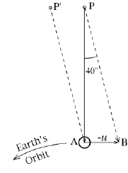 In the drawing shown here, let A be the Earth and AP the direction towards Polaris (the star itself is much more distant). The vector PA represents the velocity of light coming from Polaris at c=300,000 km/s. The vector AB represents the velocity -u of Polaris relative to Earth, equal in size to the Earth's velocity u=30 km/s in its orbit, but in opposite direction. (To simplify the calculation we assume AP is perpendicular to AB, in which case the apparent motion of the star is a circle; actually the angle is usually less than 90° making the apparent motion not a circle but an ellipse.) The point P ' indicates the apparent direction of Polaris as viewed from Earth, offset by an angle a=40" from its actual direction.